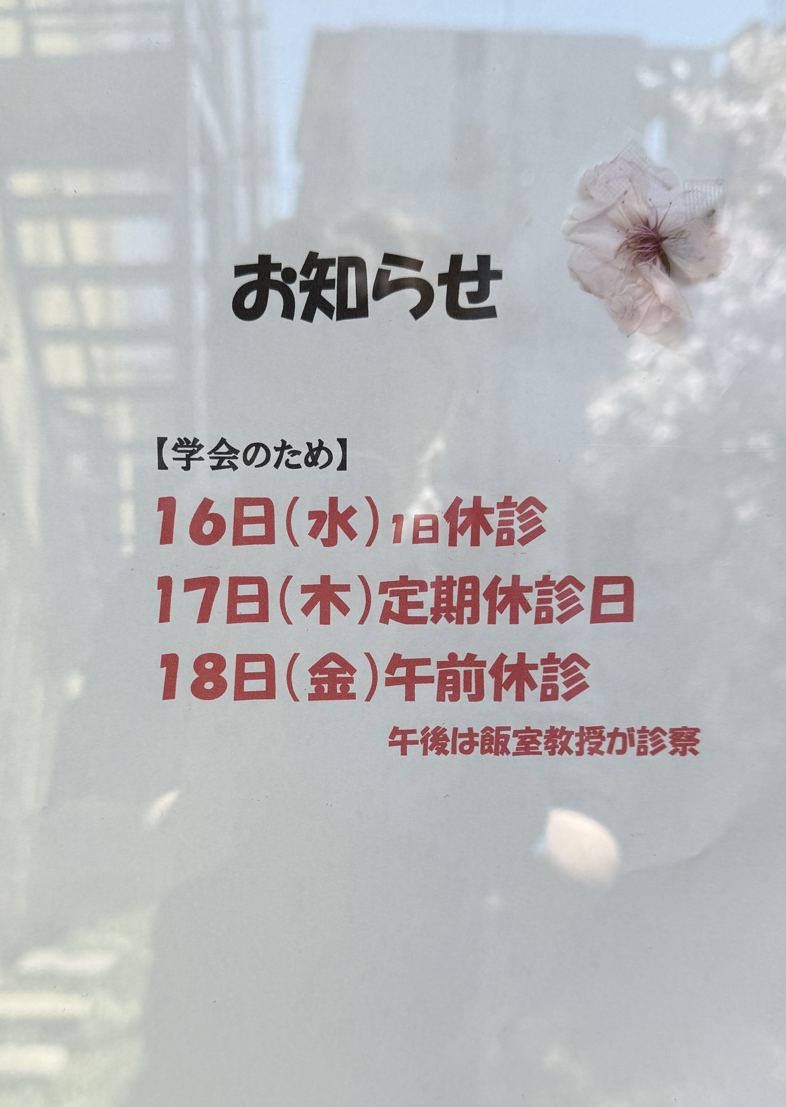 4/18(金)午前休診(午後診療14時~) ※午後は飯室教授が診察させて頂きます。